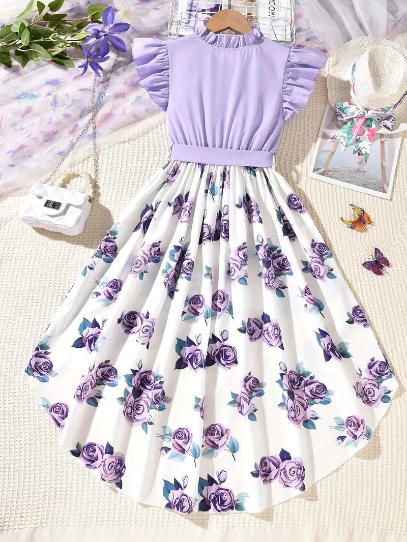 Fashionable Girls Floral Splicing Dress with Ruffled Detail & Adjustable Belt 1731