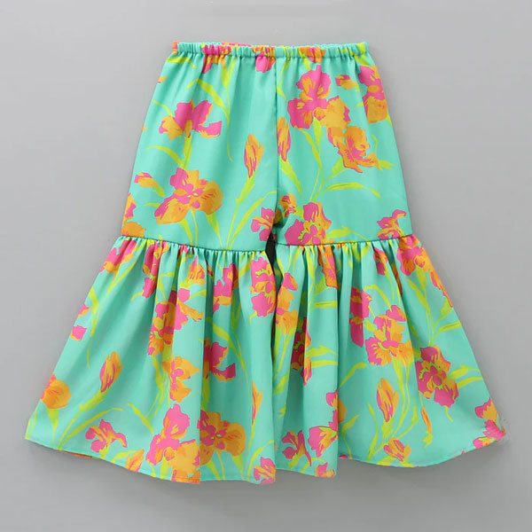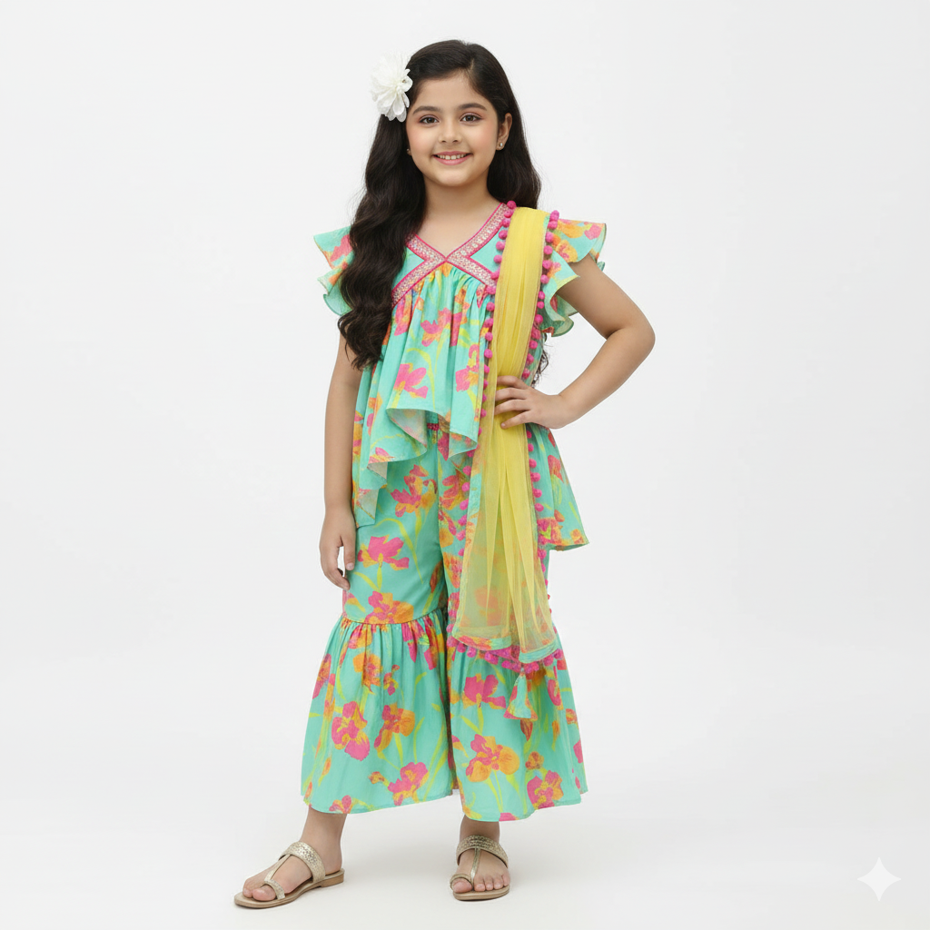 ছাড়Vibrant Blossom Ensemble: Multicolor Floral Top with Sharara and Gota Lace Dupatta 1904
